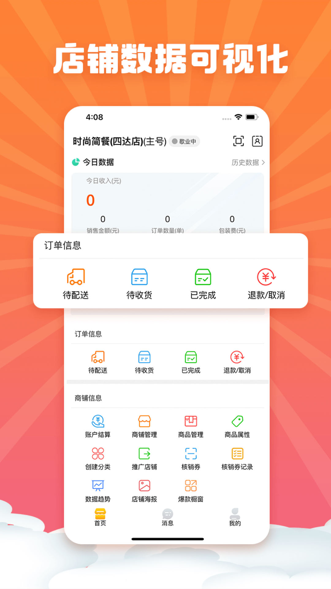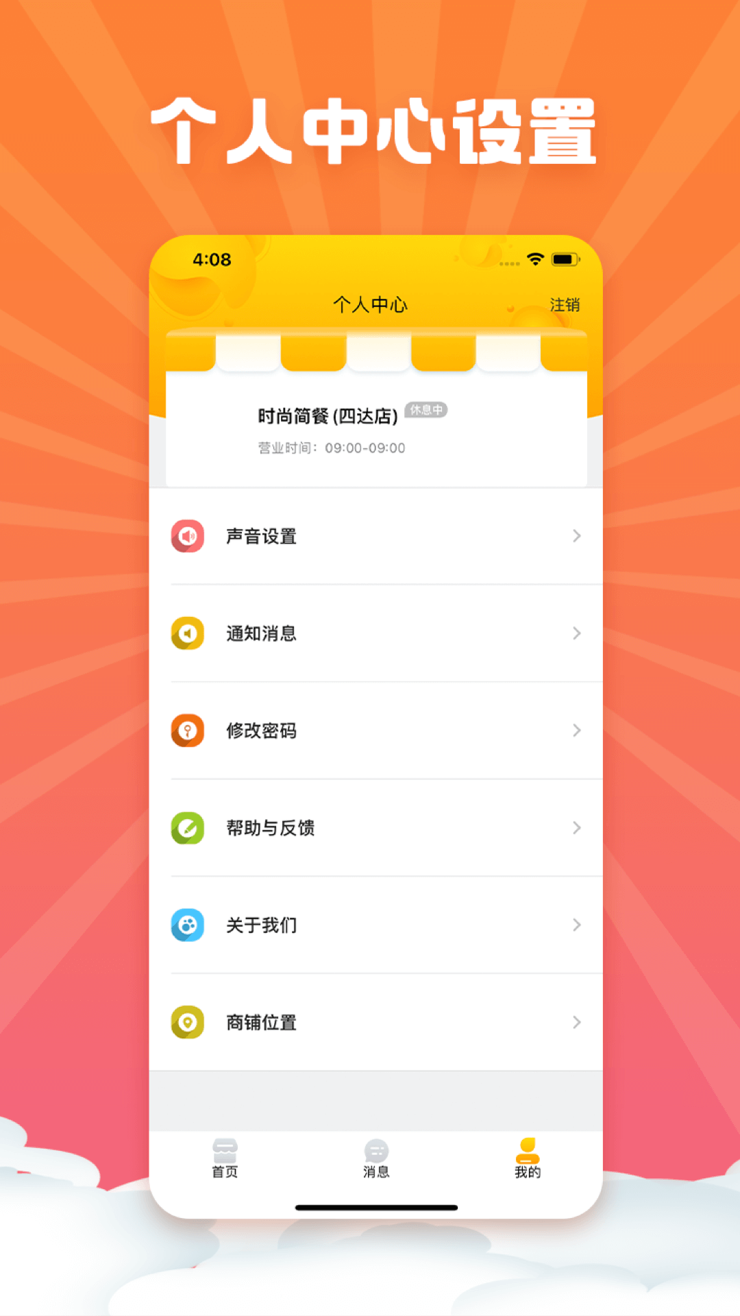 1、商家资料管理,包含店铺基本资料,LOGO,营业状态,营业时间,联系人,联系电话等