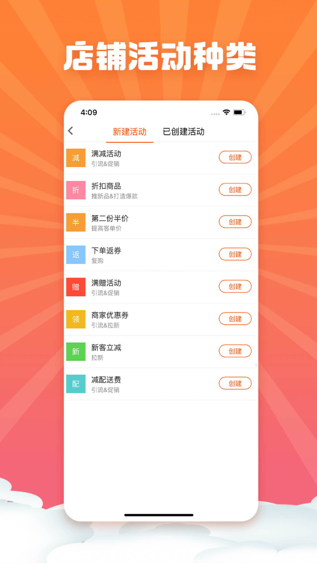 4、活动管理,包含满减,满赠,满返,优惠券发放,折扣商品,半价商品,会员价商品等